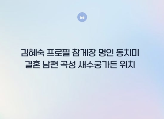 이상으로 김혜숙 프로필 참게장 명인 동치미 결혼 남편 곡성 새수궁가든 위치 에 대한 글을 마무리 합니다.